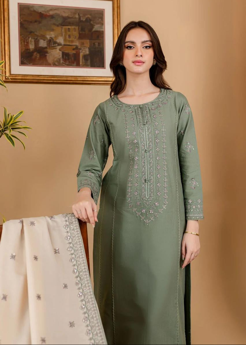 Introducing the Batik Airjet Dhanak Embroidered Collection, designed for premium winter elegance and comfort. This 3-piece Dhanak suit features heavy embroidery on the front, neck, and sleeves, paired with a premium embroidered trouser.